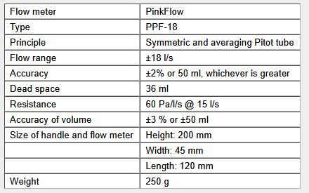 The PinkFlow* flow-meter and the spirometer fully complies with the specifications and requirements of the Standardization of Lung Function Testing ATS/ERS Task force (European Respiratory Journal 2005)Connecting to a laptop PC provides full portability in battery mode as well