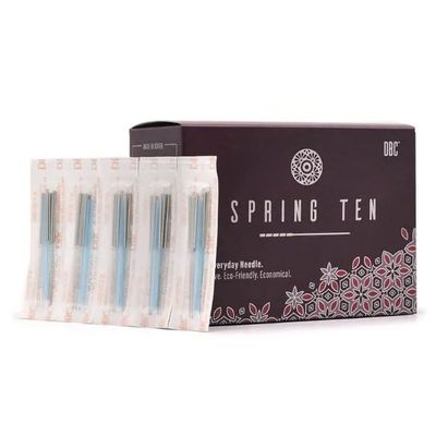 High quality bulk packaged needles at an economical price. The DBC Spring Ten needle is manufactured in an automated facility, giving it consistency and quality unrivaled by other needles in the market. Sterile disposable, surgical stainless steel acupuncture needles with 25 mm "spring" style metal handle. 10 needles with 1 insertion tube per sterile bulk package. Box of 1000 needles.