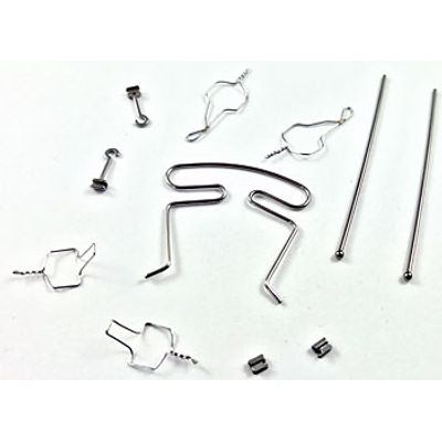 Springs and Auxiliaries: Ligature Ties. Kobayashi Ties. Open, closed and stop wound niti springs. Niti extension springs.