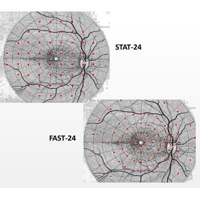 MonCvONE proposes two sets of tests for static perimetry: The STAT tests use a conventional distribution of test points with a uniform spacing. The FAST tests (Fiber Adapted Static Tests) use an optimized distribution of test points according to the density of fibers and to the most frequent alterations of the retina and optic nerve. The test library includes STAT and FAST procedures covering eccentricities up to 10, 24, 30 and 60 degrees. Tests for Blue / yellow perimetry (SWAP) are also provided in the PRO version.