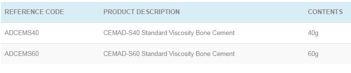Cemad Standard Viscosity Bone Cement is acrylic based bone cements manufactured by Aditus Medical GmbH. Cemad designed for joint implants.It is containing 40 g of radiopaque powder sterilized by ethylene oxide and an ampoule with 20 ml of liquid sterilized by filtration.