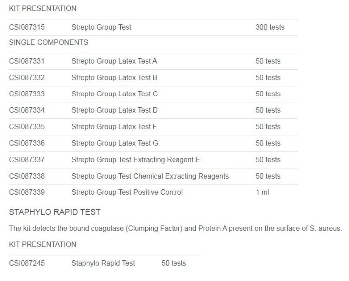 The test utilizes the agglutination between the specific streptococcal antigen and the specific serum adsorbed on the latex. If the sample shows a negative reaction with the latexes of Groups A, B, C, D, F and G, enzymatic extraction is performed and tested with the Group D latex.