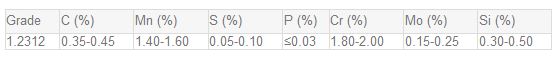 1.2312 steel material is a great plastic mold steel in the industry. 1.2312 (40CrMnMoS8-6) belongs to the stand of alloy tool steel of DIN. And many people also call it as 2312 steel. It’s polishing property and machinability are good. And the hardness of everywhere is average with high wear resistance. DIN 1.2312 steel material usually be used in the blowing mould, structural parts, forming tools, injection mold due to the good hardness, high-temperature strength and mechanical property.