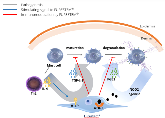 MoA : IL-4 is secreted from Th2 cells. FURESTEM-AD® Inj. is stimulated by IL-4. Stimulated FURESTEM-AD® Inj. secretes TGF-ß1. TGF-ß1 suppresses expression of FceR1 receptor (during maturation of mast cells). FURESTEM-AD® Inj. secretes PGE2. PGE2 suppresses degranulation of mast cells. FURESTEM-AD® Inj. inhibits each step of mast cell activation and degranulation through the secretions of TGF-ß1 & PGE2.