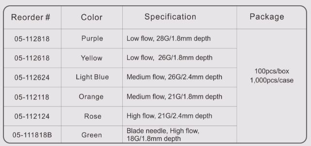 Different needle sizes for different skin types and applications for each capillary test.
