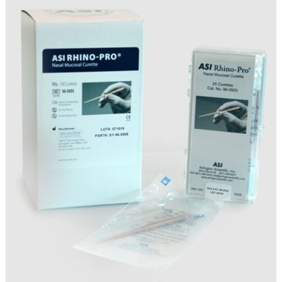 The ASI Rhino-Pro® Curette is a sterile, disposable nasal mucosal collection device designed to collect the optimum specimen with little or no discomfort to the patient. ASI Rhino-Pro® provides consistent and uniform mucosal samples with up to 1,000 times more cells than any other method. Cells do not adhere to the device, and no degranulation or distortion is seen after staining. Samples obtained can help determine cellular immunologic response. Allergic Rhinitis, Chronic Rhinitis, Infectious Rhinitis, Rapid Viral Testing, Differentiates Viral from bacterial Bacterial Rhinitis, Use for RSV sample collection.