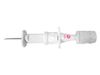 The syringe can be attached to the device by removing the cap on top of the device and using the luer lock connection underneath.