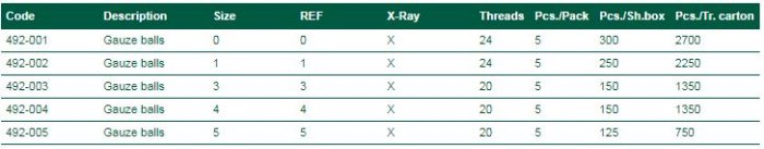 Cotton. 24 threads/sq.cm with approx. 37g/sq.m; 20 threads/sq.cm with approx. 27g/sq.m, according to EN 14079. X-Ray detectable thread. The product is presented inside the cavities of the package. Each package has 5 cavities. Products are controlled by visual conference of the package and it’s fulfilled five cavities. 5 cavities package with double control tag + Peel-open pack + shelf box + transport carton.