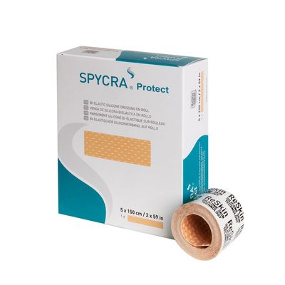 Spycra Protect is a soft, one-sided silicone adhesive dressing. Spycra Protect is a bi-elastic dressing; elastic in both directions - in the length and in the width -, can be repositioned and has rounded edges to stay better in place. The bi-elasticity diminishes the effects of friction preventing the appearance of skin lesions in case of fragile skin (prevention of skin tears, scratch wounds,…)or in case of skin@risk (prevention of blistering when walking, running, ….) The wide scaled pore structure of the dressing allows the dressing to breath and supports an optimal wound healing process based on the principle of moist wound healing. Top layer of lycra fibers, giving the dressing a silken-like look. Does not absorb..