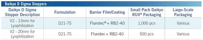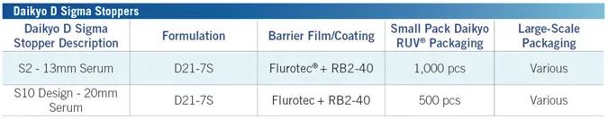 Daikyo D Sigma components are available in Ready-to-Use-Validated (DAIKYO RUV®) and Ready-to-Sterilize-Validated (DAIKYO RSV®) quality. The variety of packaging configurations ranges from DAIKYO RUV® Small Packs (500/1,000pcs) to standard commercial configurations in STERILizableBAG™ or ported bag packaging depending on your need. To find out more about our sterile DAIKYO RUV® small-quantity offerings, please refer to the below table.