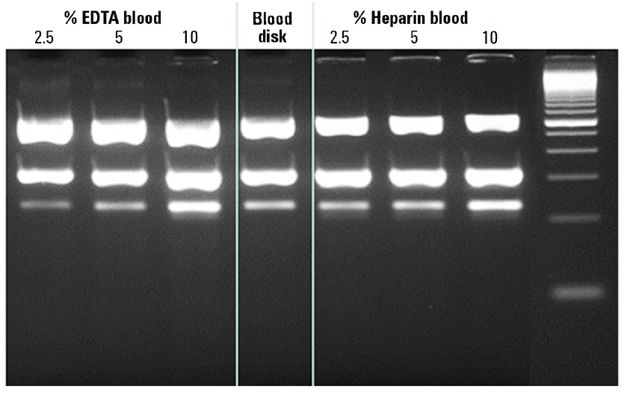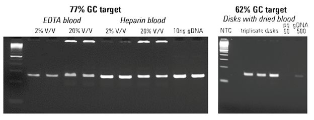 As an extension of Agilent`s portfolio of robust, high fidelity and long range DNA polymerases, SureDirect Blood PCR Kit consistently amplifies long amplicons (2.6 kb), high GC templates (77%) (see Figure 2), and is capable of multiplexing up to 3 targets in the presence of blood (see Figure 3), EDTA and Heparin. The versatile master mix can be used for direct PCR amplification from fresh liquid and frozen blood, dried blood on filter paper, serum, and plasma. Performance has been validated on blood samples from human, dog, cat, rat, mouse and pig.