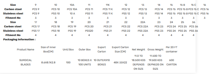 Paramount Surgimed is a manufacturer / producer and exporter for all kinds of quality stainless steel surgical blades and carbon steel surgical blades based in New Delhi, India. Surgical blades are available in the following sizes 10, 10A, 11, 11K, 12, 15, 15D, 18, 20, 21, 22, 22A, 23, 24, 25 & 36. They are made of either Carbon steel or Stainless steel (sterile or non-sterile) singly packed in peel open pouches with a VCI protective inner line. A convenient number of individual pouches are boxed in a unit carton. The surgical blades are sterilized by gamma radiation to a minimum dosage of 2.5M Rad.