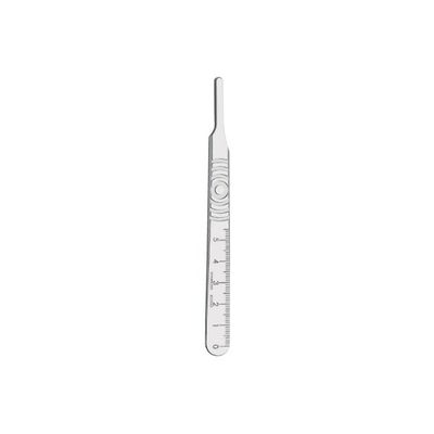 Stainless Steel Handles with a measure or graduation on the reverse side to assist with training, marking of the correct surgical site and trauma injury investigations. Fitment No.4. for Blades - including No.18, 19, 20, 21, 22, 22A, 23, 24, 25, 25A, 26, 27 and 36. Individually wrapped and boxed in units of 10.