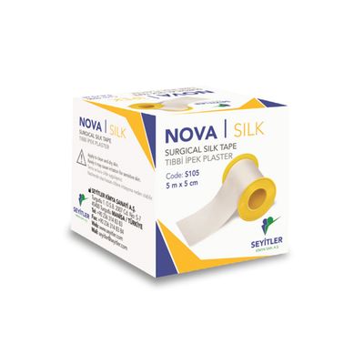 Surgical silk tape for securing medical devices and fixation of dressings. Silk acetate fabric carrier. Powerful adhesion, can be torn easily by hand. Strong, reliable securing. Skin friendly adhesive. Radiotransparent.