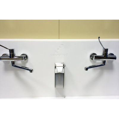 Wall mounted surgical wash basins available in different materials. The wall mounted surgical wash basins are available in different materials: stainless steel or Corian. They are available with one, two or three sizes and the dispenser can be controlled manually or electronically.