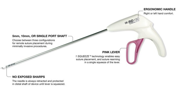 The RD180® line of suturing devices provide a safer alternative to hand stitching in laparoscopic cases. With easy squeeze and release technology and no exposed sharps, these conveniently designed suture running devices enable minimally invasive gynecologic, general, and colorectal surgeries.