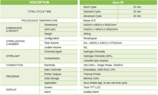 Table-Top Sterilizer Allows Effective Use Of a Small Space. Fast sterilization cycle : 25 minutes. 6 cycle per one cassette. Printer provided for ease data management. Best to use in a medical or dental clinic, etc. Specialized cart is designed to allow easy moving (the cart is optional). Login Function. Provide User ID and PW. so that hospital can manage users who access the sterilizer. Automatic PM Alarm System. Provide alarms to prevent from irregular maintenance. Zeus Mobile App. to see real time cycle. Terminatty sterilized devices maintain sterility so they can be used immediately or be stored for later use. Small enough for placement in almost any area including OR substerile rooms, OR surgical cores and specialty, departments where rapid instrument turnaround is critical.