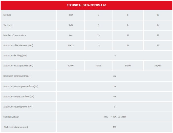 PREXIMA 80 tablet press is designed for R&D applications and small scale production. In R&D configuration the machine offers wide range of tools to characterize the tablet; it furthermore offers flexibility on any tablet dimension, as the MIX turret fits four stations B and four station D. Mating this machine with IMAGO R&D software, available as an option, makes the ideal choice for R&D departments. An equivalent machine model is available also for high containment installation in OEB 5 configuration.