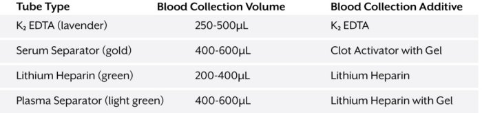 The Tasso+ device collects whole liquid blood samples that are ready to be used for a variety of downstream applications. Multiple standard collection tubes are compatible. Users can successfully collect blood samples at home without direct interaction at a lab or with a mobile phlebotomist.