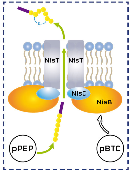 We use Lactococcus lactis and Escherichia coli bacteria to produce peptides of therapeutic interest. The lanthipeptide enzyme system introduced into the bacteria is triggered to introduce one or more thioether bridges in specific locations in these peptides. Once the thioether bridges are formed, the lanthipeptides can be transported out of the Lactococcus bacteria into the extracellular medium to be easily purified, or harvested after intracellular production in E. coli.