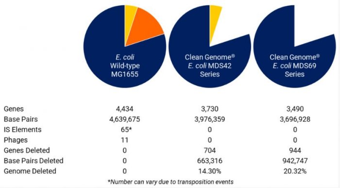 Clean Genome® E. coli is engineered to be completely free of IS elements removing the risk of IS-induced mutations. In addition to the danger of IS elements transposing into genes or regulatory elements of interest, commercial nucleic acid preparations from other vendors typically contain multiple IS elements.