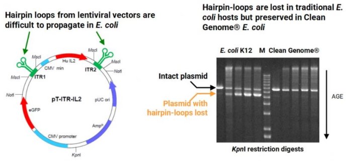 The ubiquitous impact of IS elements was apparent when the first whole synthetic organism – a strain of the bacteria Mycoplasma mycoides – was carefully engineered; after intermediate passage through DH10B, a regular E. coli strain, its genome was found to be contaminated with IS1.Vectors such as those from lentiviruses typically contain hairpin-loop structures that are unstable in traditional E. coli hosts, resulting in the vectors being deleted for the hairpin loops. By contrast, hairpin-loop structures are retained in Clean Genome® E. coli (green arrows indicate hairpin loops):