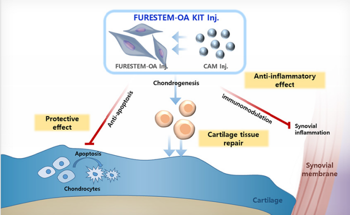 MoA : In combination of two components (FURESTEM-OA and CAM Inj.) the administered stem cells have the ability to differentiate into chondrocytes as well as being able to enhance inflammation modulation thus promoting osteoarthritic mitigation and cartilage regeneration.