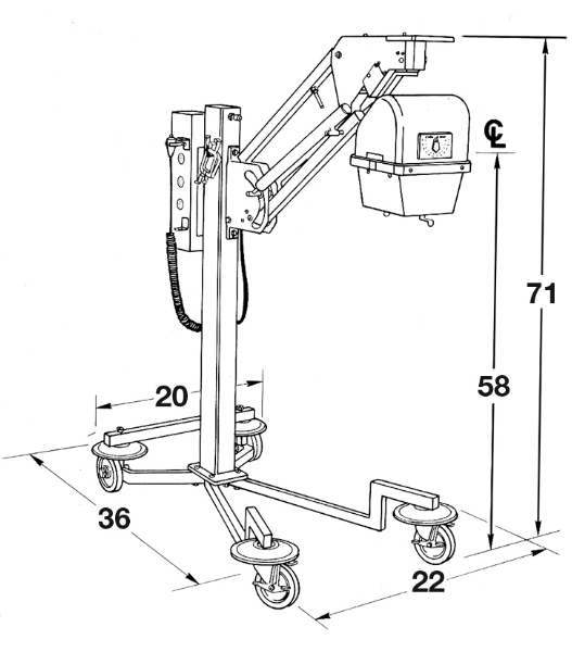 Easy-to-roll mobile unit. Removeable and adjustable table for treatment of hands and feet. Control box is mounted on the post featuring a pivot to enable viewing the controls from three different positions. Plastic tipped treatment cones, 1cm, 3cm, and 5cm at 12cm target to skin distance, are standard. Effective for treatment of eczema and psoriasis.