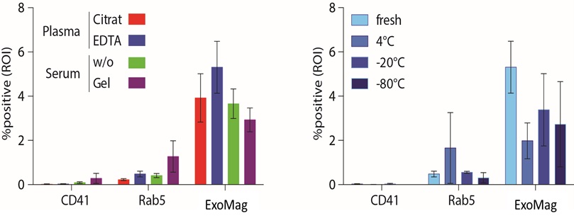 Legend: Serum and plasma obtained from one healthy volunteer with different anticoagulants results in different yields (left). Yield is also dependent on storage conditions (right). CD 41 serves as control to confirm that exosomes are not derived from platelets.