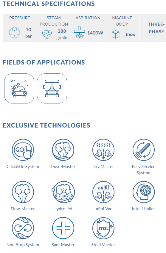 REVIVE 9000 is the new three-phase "steam & suction" machine (for the removal of dirt performed by steam extraction) designed by STI for the cleaning, disinfection and sanitization of cars / means of transport / ambulances / boats etc. Dirt is removed through three actions: thermal (steam temperature), chemical (vegetable detergent) and mechanical (steam jet pressure). Thanks to its stainless steel structure, REVIVE 9000 is the ideal machine for the most demanding cleaning jobs, offering, in addition to the possibility of disinfecting and sanitizing the passenger compartment, also the ability to clean the car body.