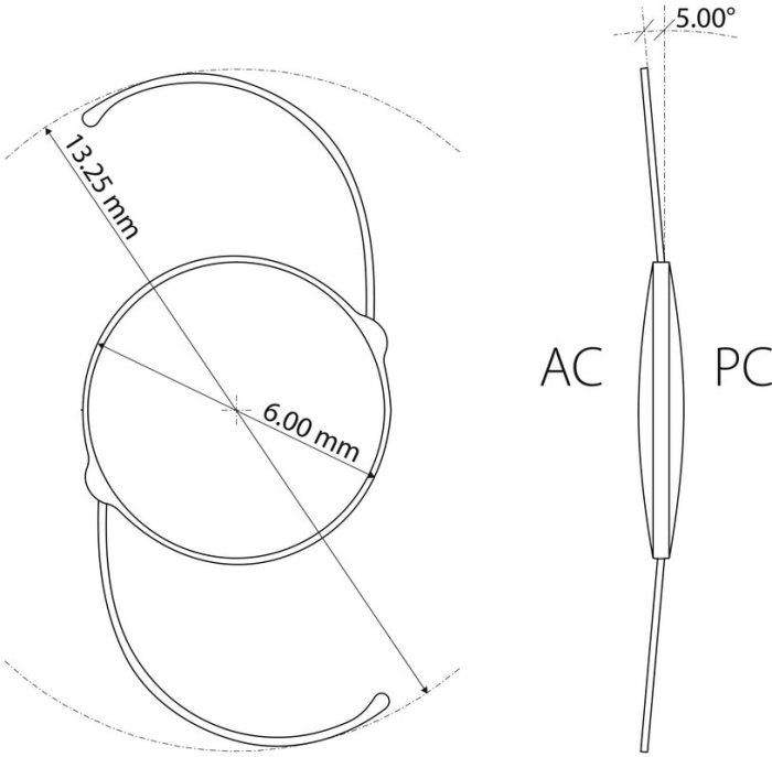 Three-piece lens; Patented bi-aspheric design; Equiconvex optic (+1.0D to +36.0D), Meniscus (-5.0D to 0.0D); Full-angulated lens gives it more reliable posterior position.