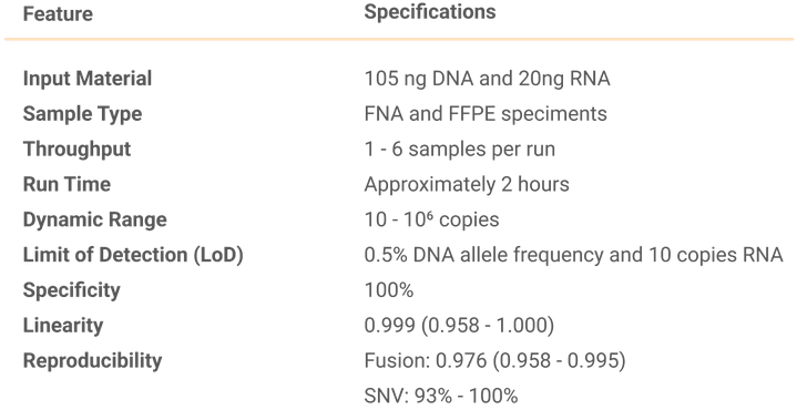 Simultaneous detection of single nucleotide variants and gene rearrangement often associated with thyroid cancer.