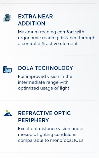 DOLA technology (diffractive optic, local asphericity) generates an optimized visual acuity in the intermediate region with reduced photic phenomena.
