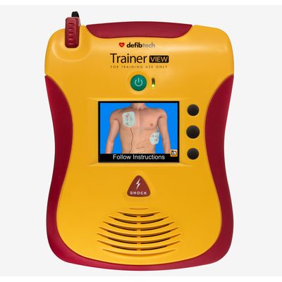 The standalone Trainer VIEW, model number DDU-2000TR, is a dedicated training system used by AED training participants to learn how to be prepared for a sudden cardiac arrest (SCA) emergency. Training class participants are instructed in the use of an AED as part of a standard rescue protocol in the event someone suffers SCA. It is externally similar to a fully-functional Defibtech DDU-2000 Series Automated External Defibrillator (AED), known as the Lifeline VIEW and the Lifeline ECG, in form and operation but all rubberized exterior surfaces are red over-molding, instead of black, to clearly distinguish the unit as a training device that cannot be used to defibrillate a real patient. The reusable training pads and rechargeable battery pack have red packaging and labels to distinguish them as being for training use only.