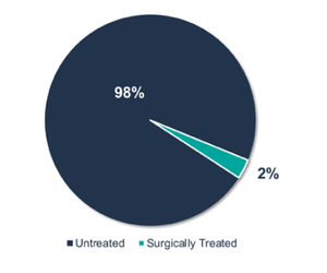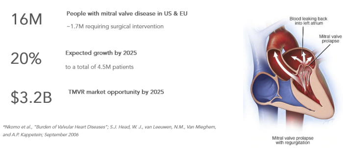 Mitral regurgitation (MR) is the most common heart valve dysfunction with an estimated 3.6M sufferers in the US and the EU alone. That number is projected to climb to 4.5M patients by 2025. Surgical repair is considered the “Gold Standard” in addressing MR, yet 98% of patients remain untreated due to the invasive nature of the surgery and prolonged recovery.