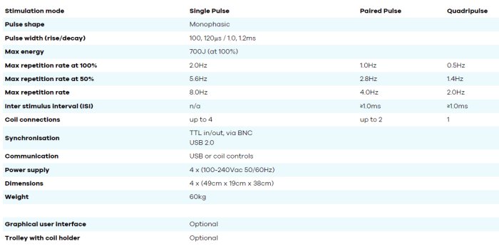 Stimulator outputs can all be set individually, or can even be combined to deliver pulses at up to 134% of a single stimulator`s output through one TMS coil. Additionally, the inter-stimulus intervals (ISI) are configurable to a resolution as low as 0.1ms. The MP-Quad can be configured to allow for slow repetitive monophasic stimulation at up to 8Hz, with stimulation at 100% output as high as 2Hz.