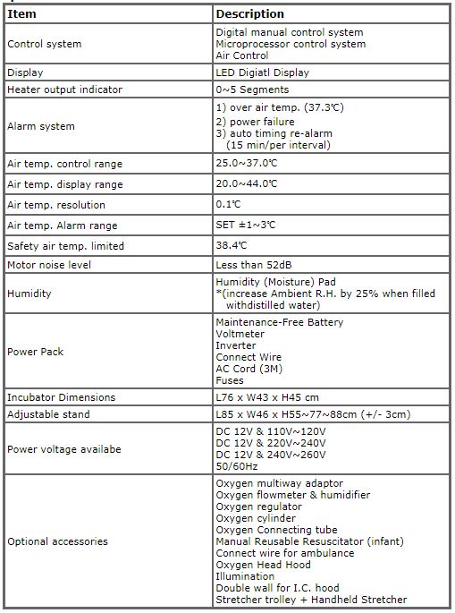 Built-in Microprocessor. Digital manual control system. Complete alarm system. Maintenance-free battery. I.V. Pole (adjustable drip stand). Convenient and adjustable stainless tray. Servo & Manual control system (Option).