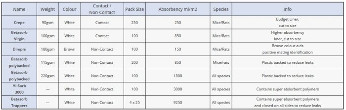 For many years we have been providing a wide variety of trayliners, whether for use under grid bottomed caging (non-contact) or for post-surgical care (contact). These speciality papers are designed to provide the right level of absorbency and are cut to the exact requirements of our clients.
