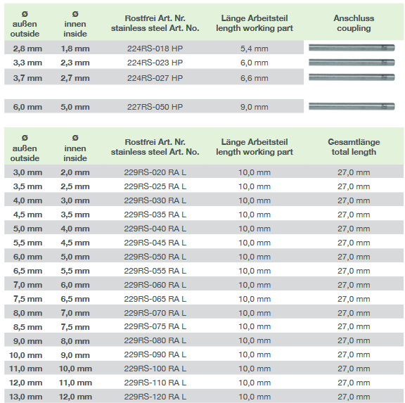 For the oral surgery we manufacture trephines and a variety of drills and burs with different coupling options. The trephines are available with different working lengths and in diameters from 3.0 to 13.0 mm. All trephines are laser marked with a depth gauge for exact burring.