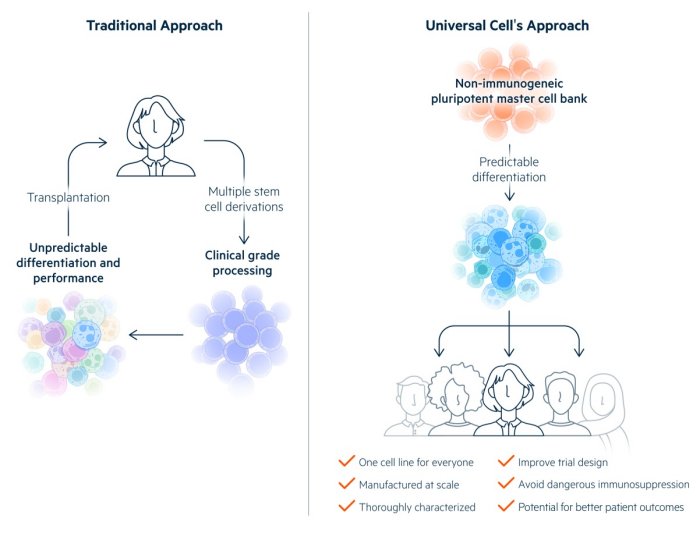 A major advantage of Universal Donor Cells (UDCs) is that a single cell line can be differentiated into multiple therapeutic cell products. These Off-the-Shelf products can be tested in clinical trials with the goal of eventual regulatory approval. The aim is for them to be used in any recipient without allogeneic rejection, reducing costs and leading to better patient outcomes.