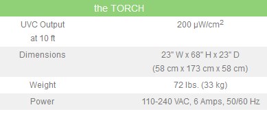 The TORCH Tower outputs UVC light at 200 μw/cm2 to provide rapid disinfection