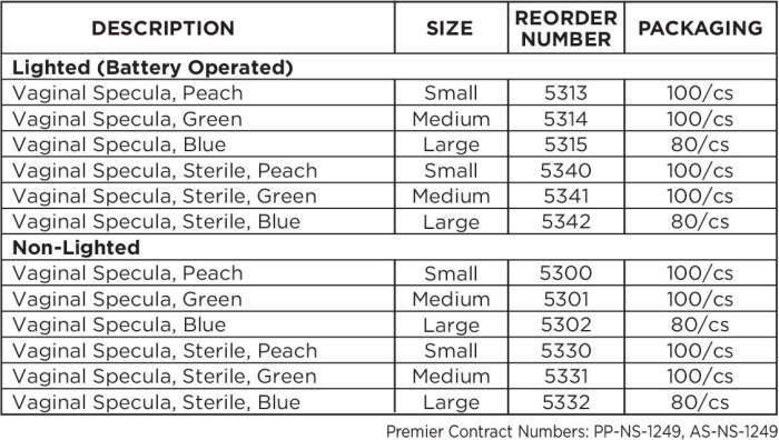 PremierPro™ Vaginal Specula are available in three sizes with color coded handles for easy identification. Sterile and non-sterile options available. Lighted and Non-Lighted options both have a wide handle for ease of use. Lighted options are cordless and include batteries with ON/OFF button. Batteries are removable for disposal. All Specula are individually packaged and are Single Use products.