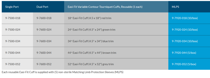 Easi-Fit cuffs contour shape in combination with a patented variable fastener allows a superior personalized fit along both proximal and distal edges of the cuff to help lower limb occlusion pressure (LOP).