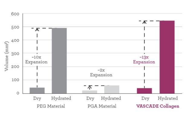 VASCADE provides tamponade as a result of rapid expansion of collagen in presence of fluid.3,4 Approximately 13x expansion in collagen patch ensures tissue tract is sufficiently filled and provides mechanical hemostasis.