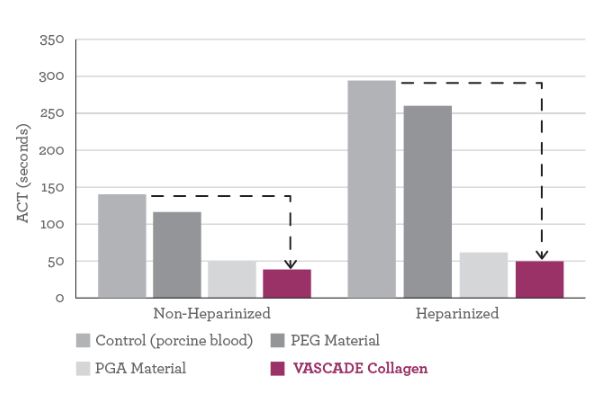 VASCADE accelerates coagulation by leveraging natural thrombogenic properties of collagen to enhance coagulation. In vitro testing demonstrates VASCADE collagen decreases clotting time in both heparinized and non-heparinized blood as compared against control (porcine blood).