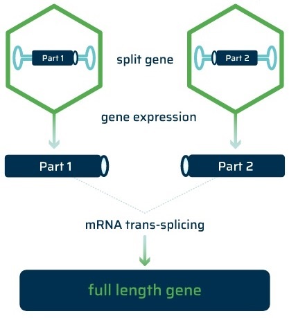 REVeRT, Reconstitution via mRNA trans-splicing, is our next generation vector platform for transfer of large genes. Messenger RNA (mRNA) splicing is a very efficient cellular process for the seamless ligation of adjacent protein coding sequences, thereby enabling the formation of a functional gene product. The splicing process, which normally takes place on a single pre-mRNA molecule (cis-splicing), can also be used to ligate two separate mRNA molecules. The latter is referred to as mRNA trans-splicing and is the basis of ViGeneron’s REVeRT technology.