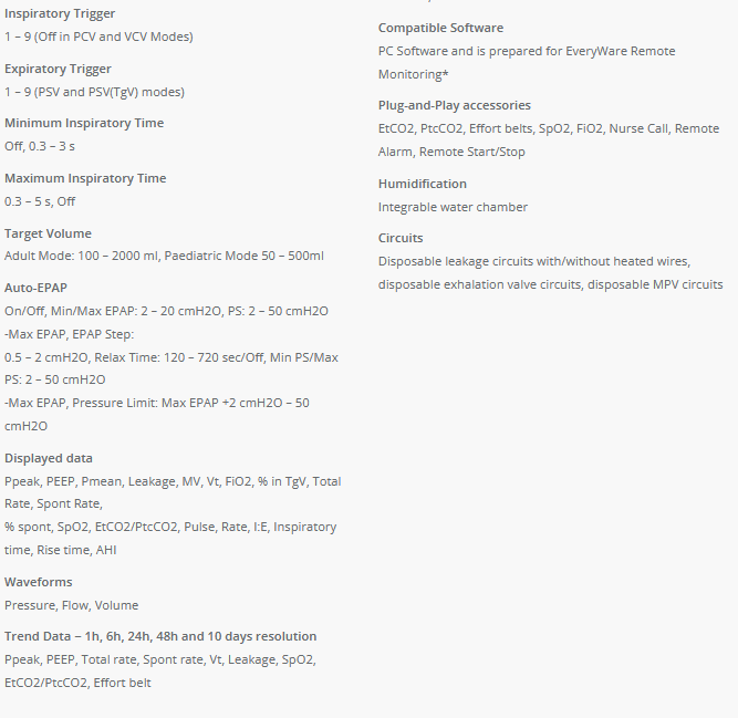 - Integrated monitoring of SpO2, FiO2, EtCO2, PtcCO2, Effort Belts