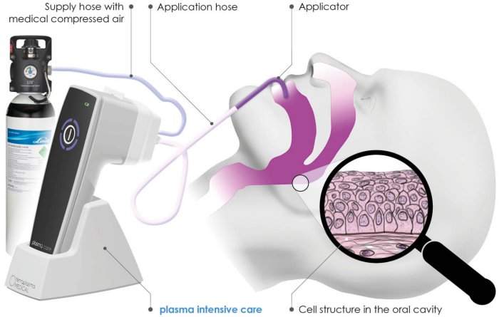 In the following, the application of the device is shown schematically. Cold plasma is generated and gently directed through the mouth into the upper respiratory tract of the ventilated patient with the help of medical compressed air.