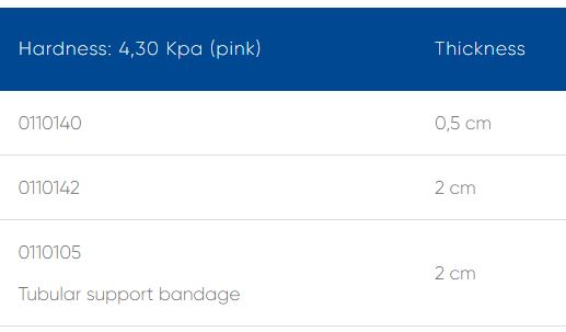 | 0110105 (PINK) | 200 x 10 x 0.5 VISCOELASTIC STRIP 200 x 10 x 2 VISCOELASTIC STRIP + COMFIFAST® TUBULAR SUPPORT BANDAGE. Density 50 kg/m3. Hardness 4.3 Kpa. Presentation: Single roll dispenser box Viscoelastic pads withsilicone adhesive |