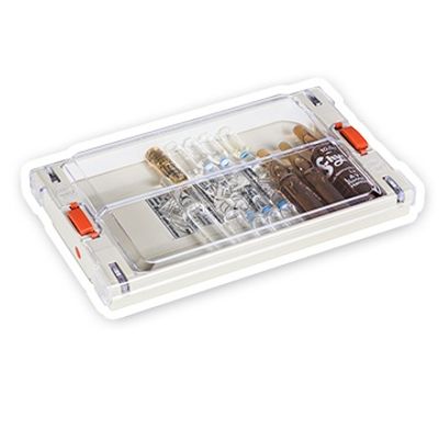 Opens automatically by pushing a button, Designed for easy and quick removal of the vials, A firm hold for vials of all sizes (up to 22 mm in diameter and 105 mm long), Clear top for greatest clarity, Stackable, Space for up to 30 vials.